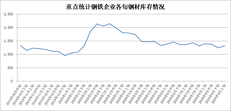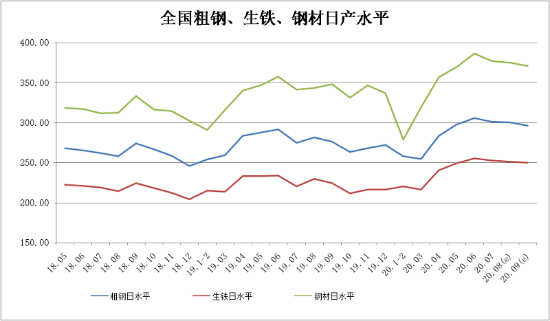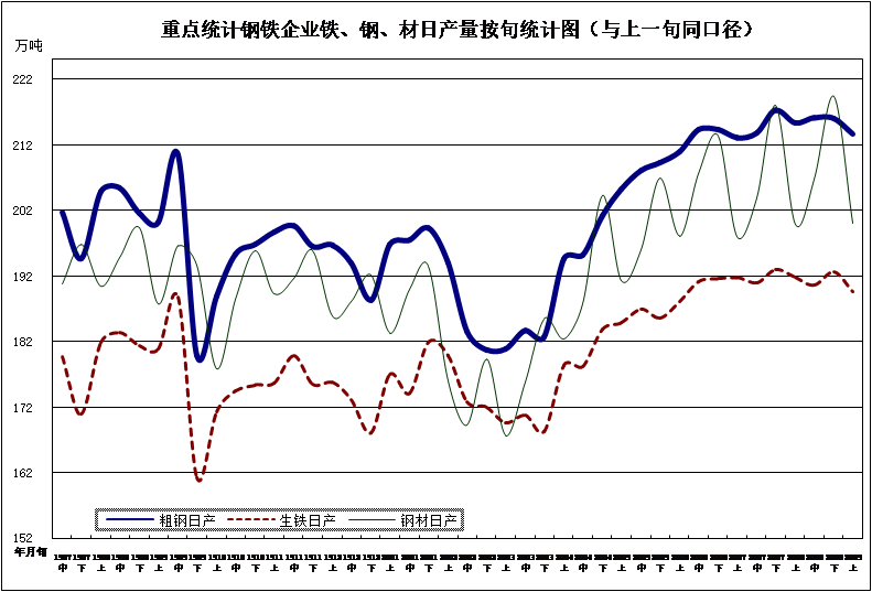 2020年9月上旬,重点统计钢铁企业共生产粗钢2136.56万吨、生铁1896.16万吨、钢材1999.30万吨、焦炭319.28万吨。本旬平均日产,粗钢213.66万吨,环比下降1.09%、同比增长6.73%;生铁189.62万吨,环比下降1.55%、同比增长4.82%;钢材199.93万吨,环比下降8.86%、同比增长6.50%。
