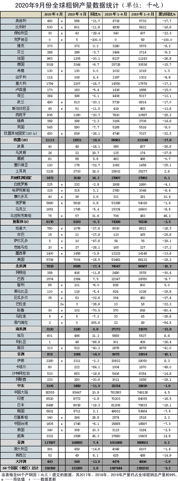 10月23日,世界钢铁协会(WSA)发布了9月份全球粗钢产量数据。9月份,全球64个纳入世界钢协统计的国家和地区粗钢产量为1.564亿吨,同比增长2.9%。