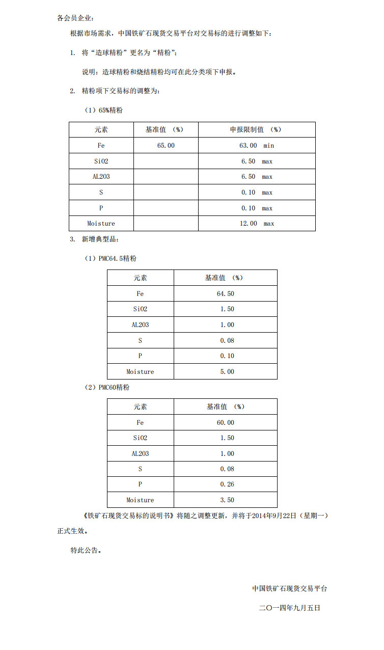 中国铁矿石现货交易平台关于调整交易标的的公告